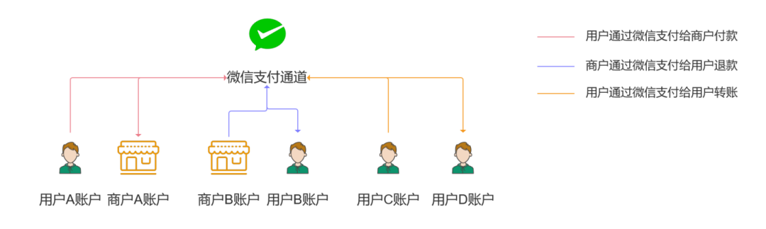 文章开头咱们也讲过,通道最终目的就算将不同收付账户之间的资金进行转移。以微信支付通道举例,可以看到通道和账户之间的关系和资金的转移。