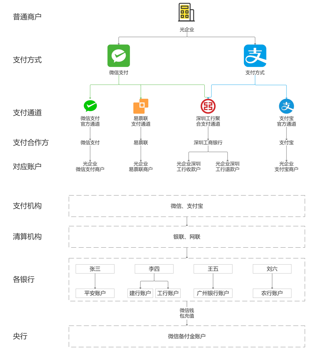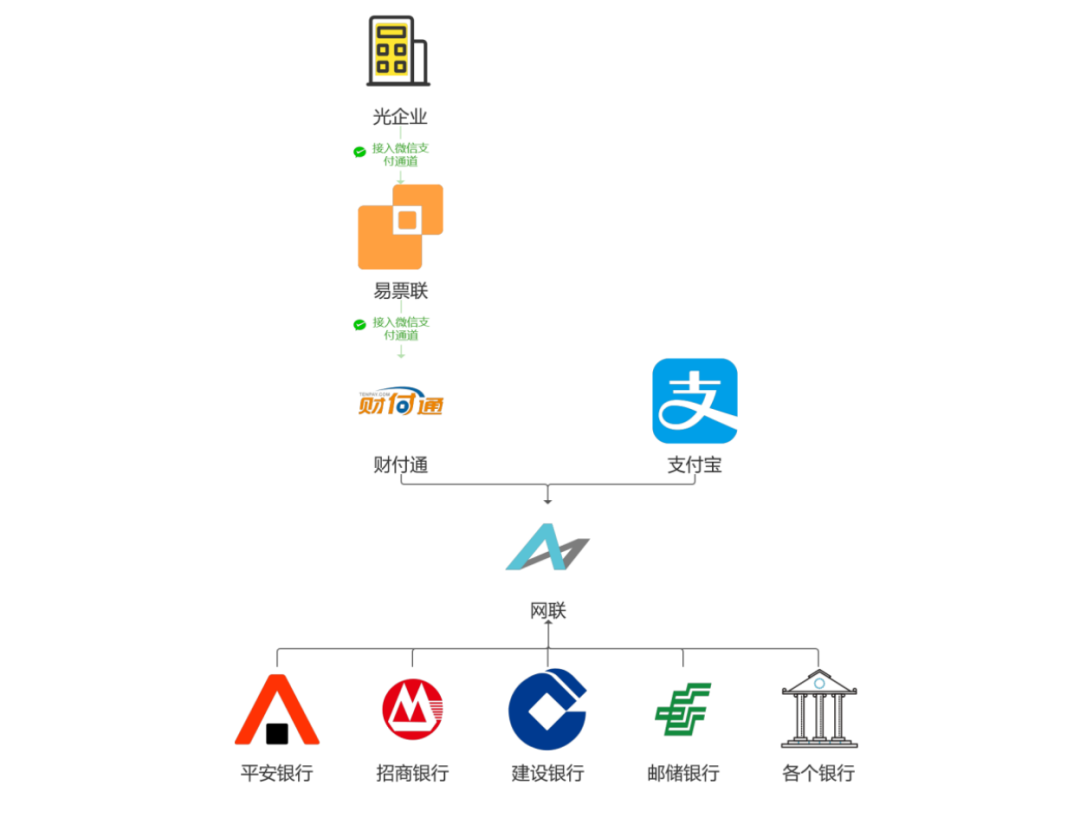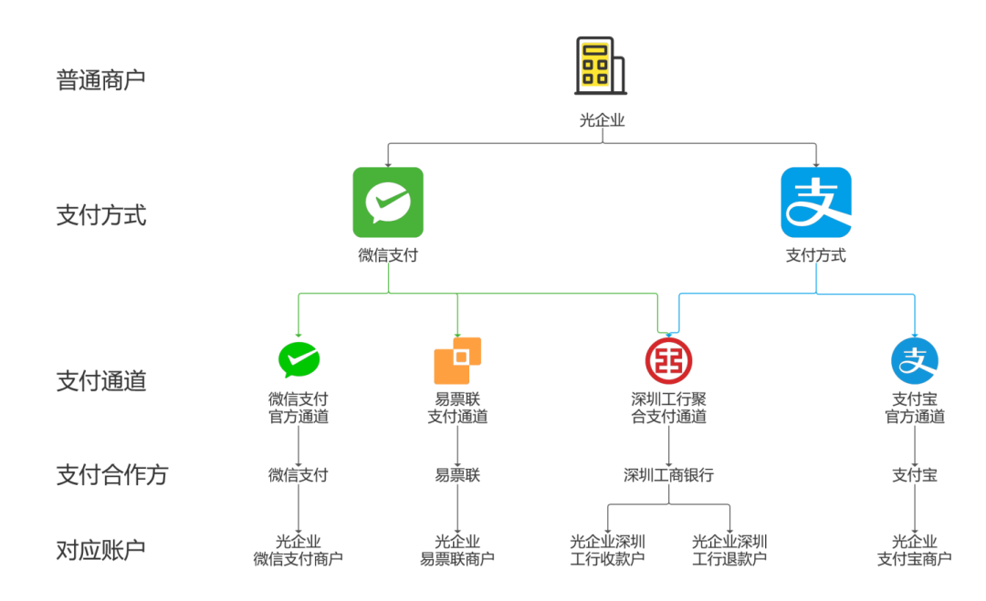支付通道跟不同的合作方,又是处于什么关系呢。假设“光企业”要通过易票联接入微信支付的通道,那这条通道跟各个机构的关系如下。