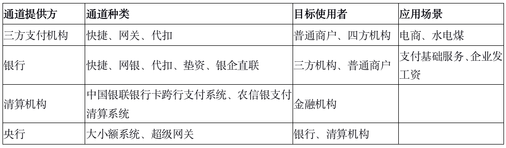 其实支付通道是分层次的,下层为上层服务。不同的角色(按有无支付牌照、金融资质区分)对应所需的通道提供方是不同的。
