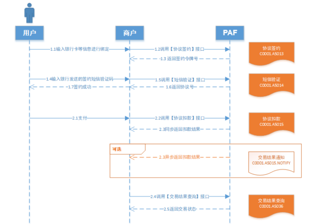 通过接口调用流程,我们可以看出要银行卡代扣通道,要完成支付之前,还需要进行签约两步。