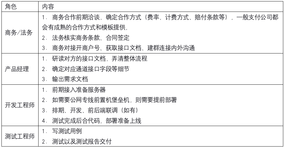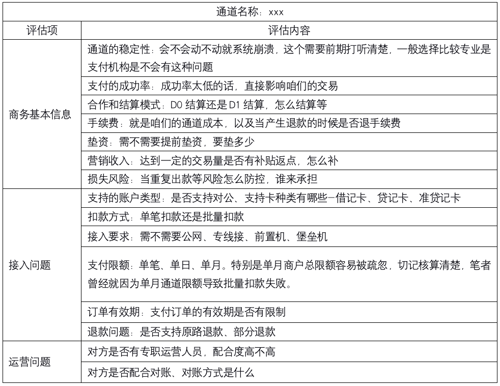 选定好合作机构之后,可以根据下表,评估该通道是否符合公司业务需求,评估满足需求的话,就可以着手接入了。