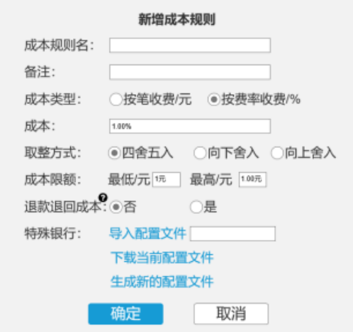 遇到银行卡通道的时候,不同的银行收的费用可能会不一样,所以可以根据自身需求定义一个特殊银行特殊配置,如果特殊银行多的话,建议用导入配置文件的交互形式。