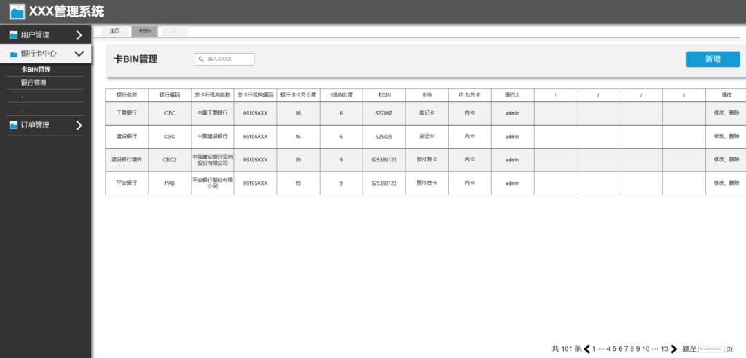 经过数据清洗之后,提取我们所需的信息,银行卡中心的卡BIN管理就出来了。更加专业一点的公司甚至会将卡BIN图标配置进来,以及将通道和卡BIN进行匹配关联维护,做到更加精细化管理通道所支持的能力。