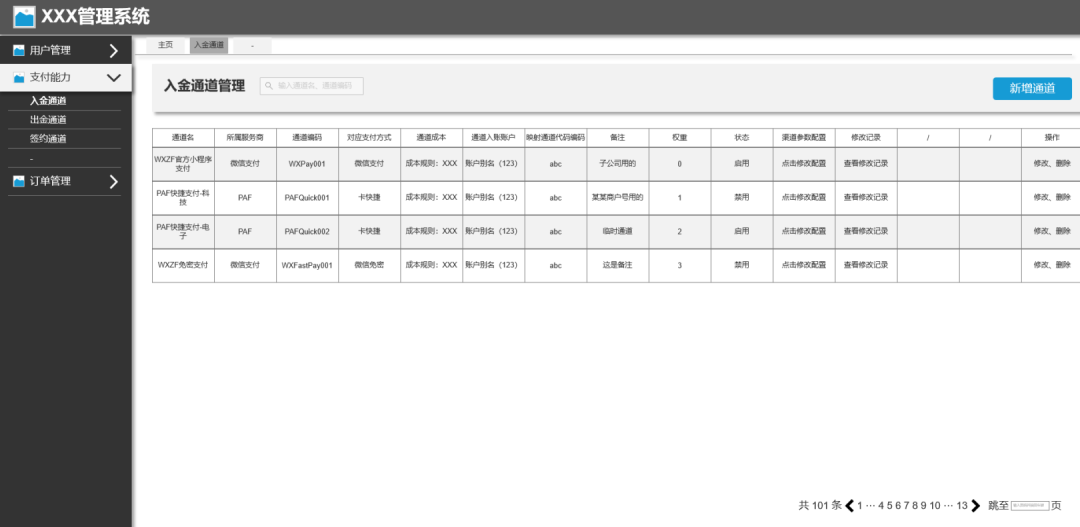 这里以入金通道举例子,接入通道之后,每一条通道都有唯一的通道名称和编码,这个好理解,就像每个人都有身份证和名称一样。然后再把通道关联上支付方式和状态,没有其他追求的话,这个通道管理也就能用起来了。